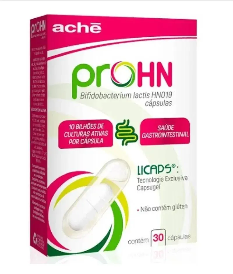 ProHN é um probiótico em cápsula com a tecnologia exclusiva LICAPS para a saúde intestinal. A ingestão de 1 cápsula ao dia fornece 1010 UFC de Bifidobacterium lactis HN019, que pode contribuir com a saúde do trato gastrointestinal.